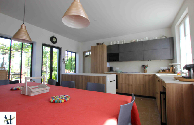 Entrée avec WC, Lave-Main et Placard - Buanderie avec Evier - Cuisine Indépendante de 24 m² avec Coin Repas donnant sur Salle à Manger d'Eté sour Auvent avec Evier - Salon Télé de 16 m² avec Bureau et Piano, donnant sur Terrasse avec Auvent - Séjour de 18 m² avec Cheminée - Chambre de 12 m² avec 2 Lits de 80, Placard et Sortie Indépendante - Chambre de 9 m² avec 2 Lits de 80 Gigognes, Placard et Bureau - Salle de Bains de 9 m² avec Double Vasques et Placard - WC Indépendant avec Lave-Main - Chambre de 16 m² avec 2 Lits de 80, Placard, Salle de Douche, Lavabo et Placard