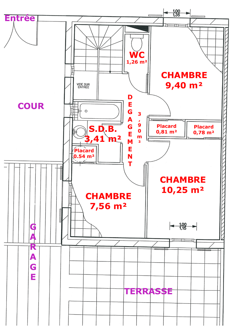 Couloir de 3,76 m² - Chambre de 9,40 m² avec 1 lit de 160, Bureau et Placard - Chambre de 9,98 m² avec 1 Lit de 160 (sommier lattes, matelas bultex), Bureau et Placard - Chambre de 6,33 m² avec 2 Lits de 90 Superposés (le couchage supérieur ne convient pas aux enfants de moins de 6 ans) (sommier, matelas mousse) , Bureau et Placard - WC de 1,43 m² Indépendant - Salle de Bains de 2,91 m² avec Lavabos