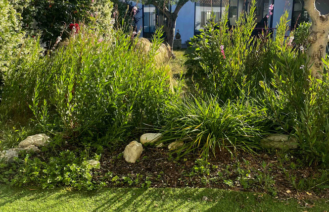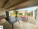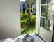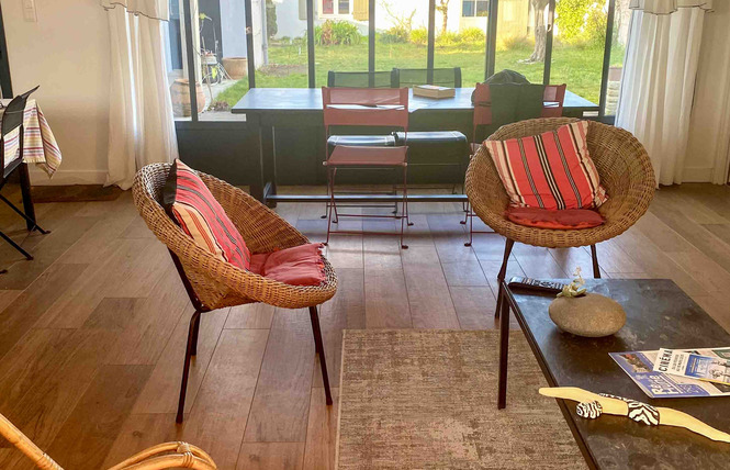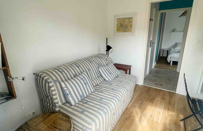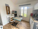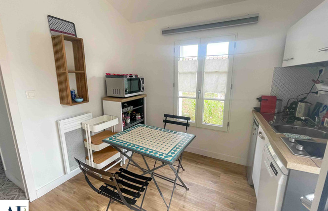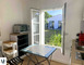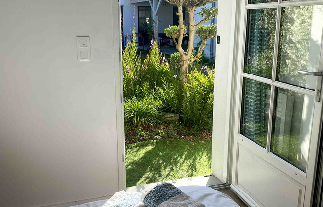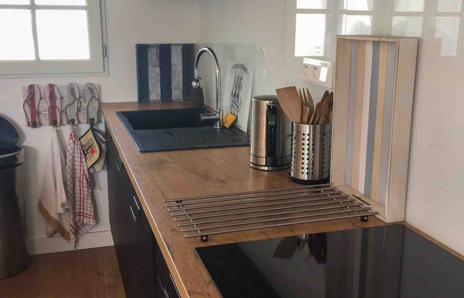 Pièce de vie avec canapé, coin kichenette avec petit réfrigérateur, petit lave vaisselle, 2 feux induction, cafetière Nespresso, bouilloire, micro ondes combiné - Terrasse sud avec table chaises et parasol -Chambre avec vue sur jardin, volets, avec 1 lit de 160, couette, salle de douche avec douche, lavabo - wc indépendant -